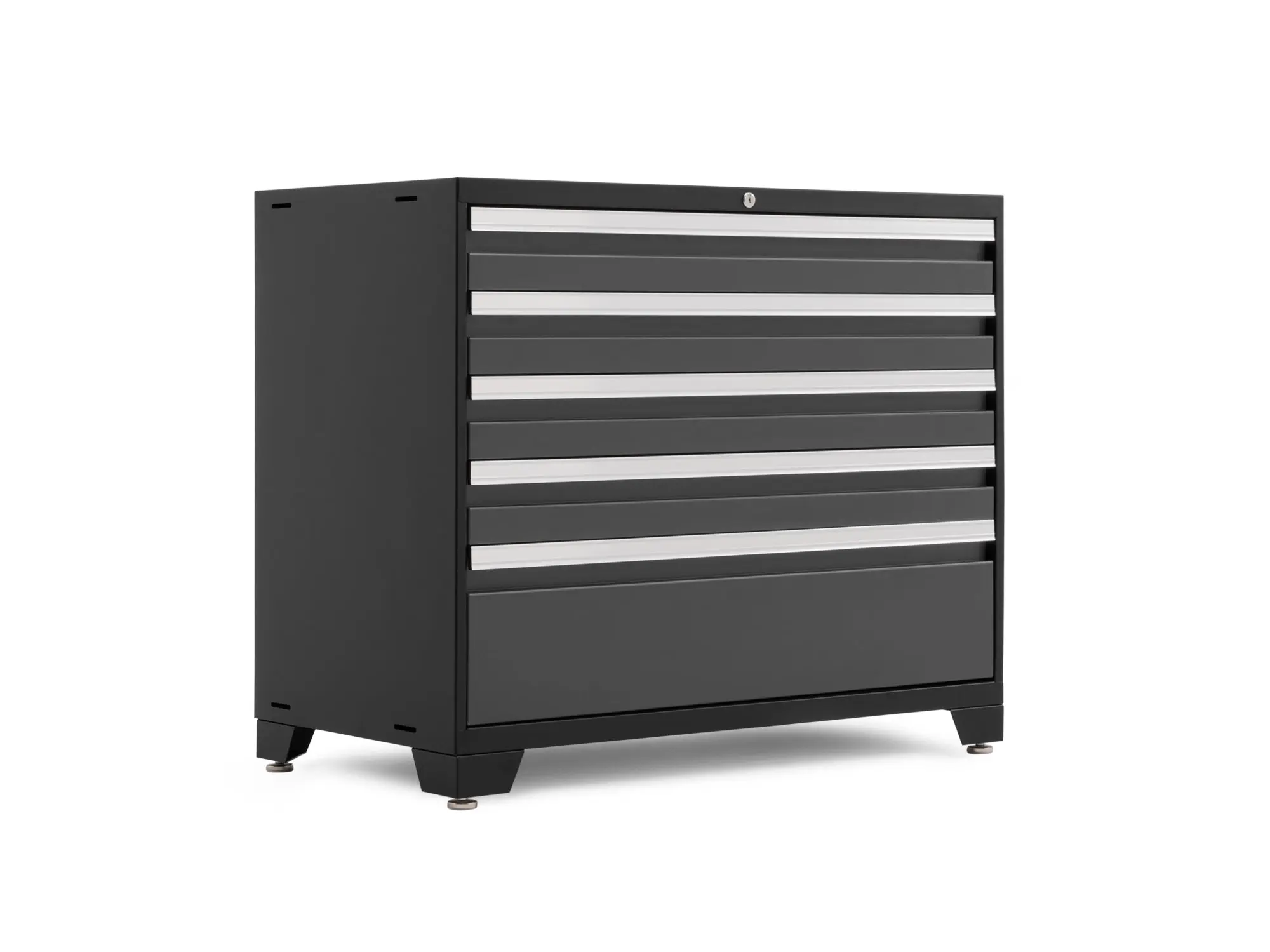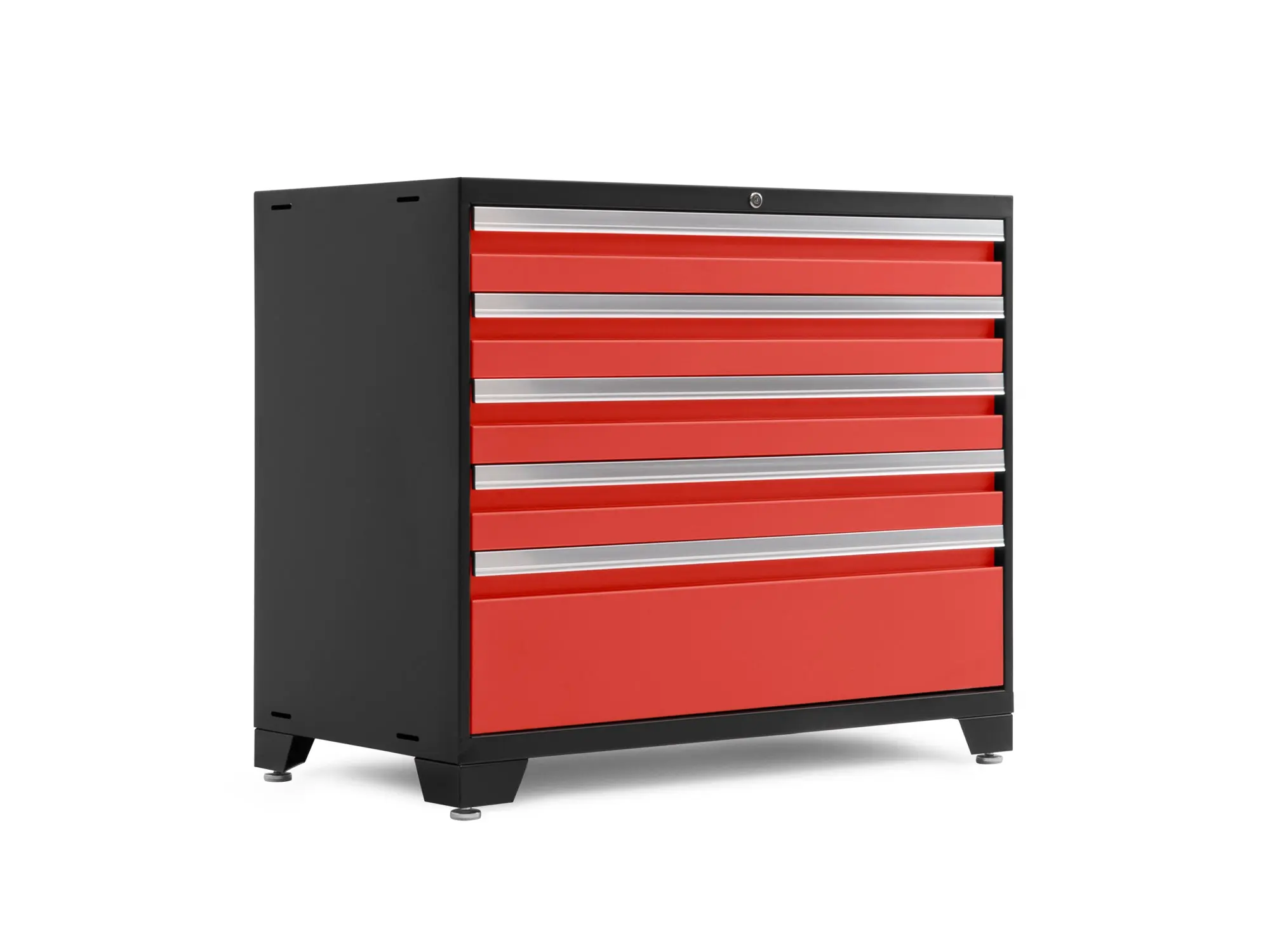 It’s time to ditch the rookie toolbox, and step up to the tool storage reserved for the Pros. The NewAge Products Pro Series 42 in. Tool Cabinet give you a massive amount of organized drawer space for storing power tools, plumbing supplies, electrical gear, painting and finishing equipment, and anything else you’ve got tucked away in every corner of your workspace. Built with heavy-gauge welded steel frames, and 5 huge full-extension drawers, this behemoth easily holds up to 1,000 lbs. of weight in a convenient storage solution that will keep you wondering how you ever lived without it. The premium soft-close drawer slides allow each drawer to glide smoothly open and closed, even under maximum weight, while the single locking mechanism allows you to quickly and easily secure your belongings. Included custom fit foam drawer liners protect your tools and prevent them from sliding around, while the slot-in steel drawer dividers give you more customization over how you separate your hardware and smaller items. The ultra-durable paint finish protects your Tool Drawer from scratches and dings from wayward hand tools, and keeps it looking like new. Installed on the floor, off the floor, on casters, or in a set, the Pro Series 42 in. Tool Drawer is the only tool storage that lets you work like a Pro.
